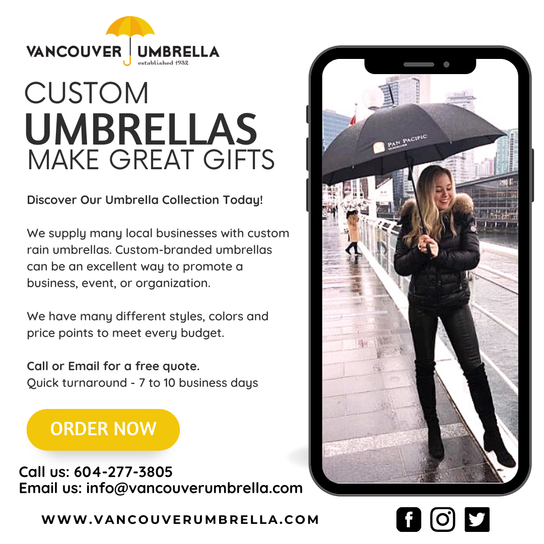 For custom orders on rain or patio umbrellas please contact us at info@vancouverumbrella.com or call us at 604-277-3805 for a quote